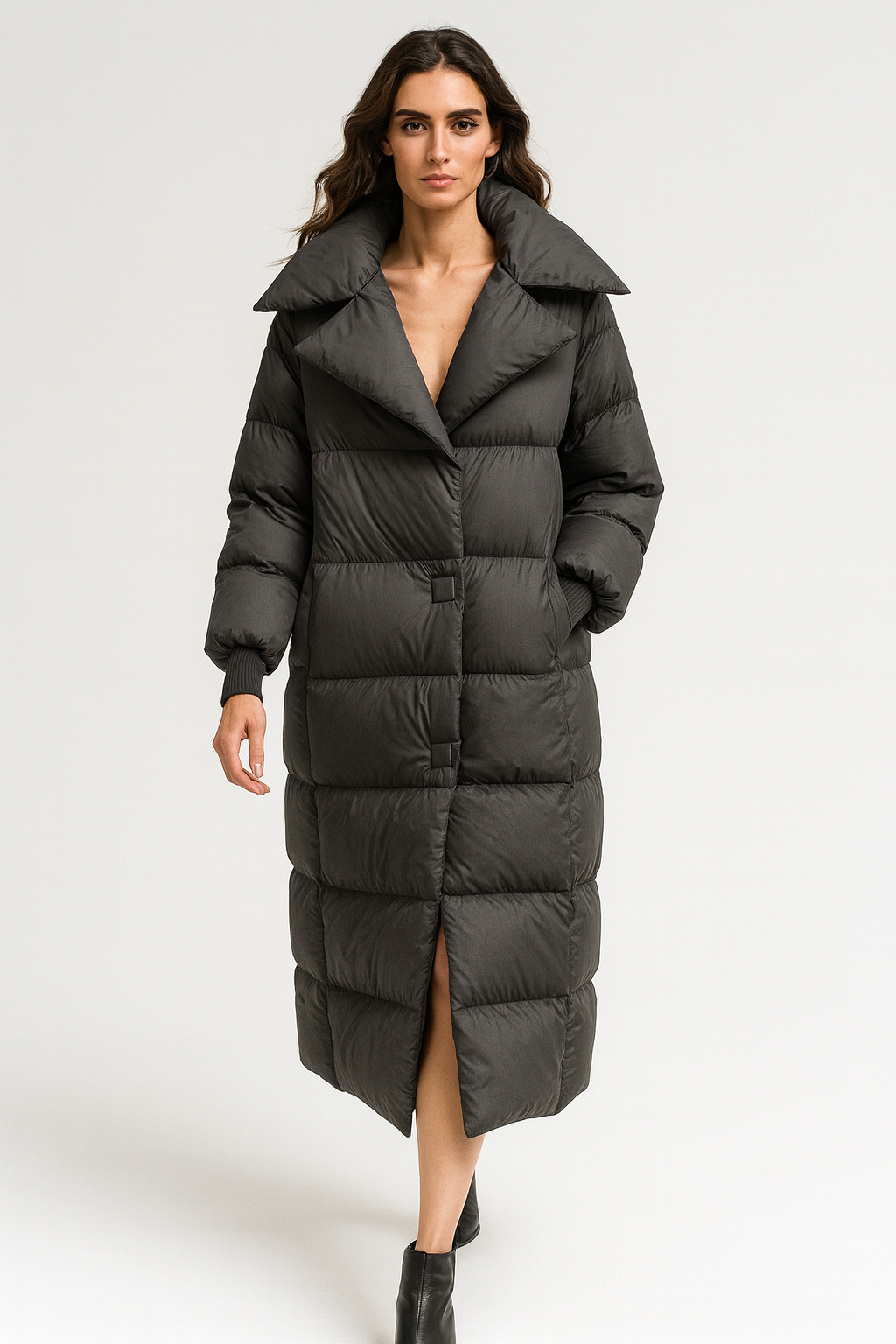 Denne lange dunjakke kombinerer et moderne og voluminøst udtryk med en afslappet silhuet, der giver en varm, omsluttende og sofistikeret følelse. De brede kanaler og den bløde konstruktion skaber et harmonisk look, mens den rummelige pasform gør jakken ideel til daglig komfort og praktiske outfits. Et funktionelt og stilfuldt overtøj, der tilfører garderoben et luksuriøst og ubesværet præg.