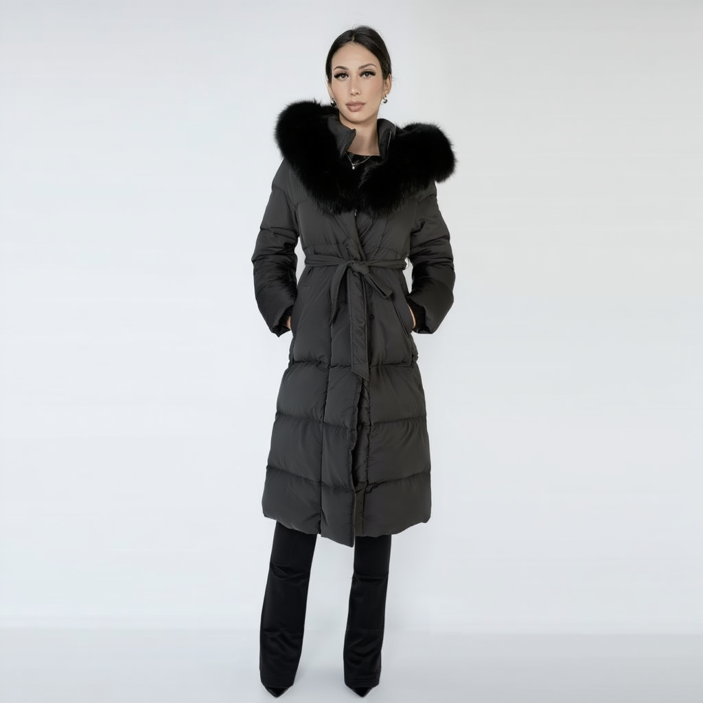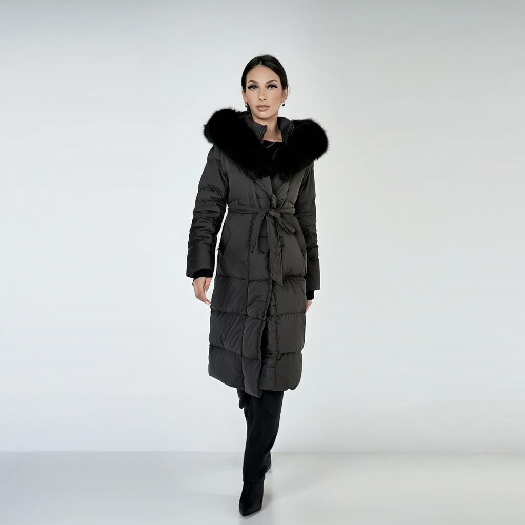 Hold varmen med stil denne vinter i en elegant, lang vatteret frakke. Frakken kombinerer praktisk varme med et feminint snit, hvor bindebæltet fremhæver taljen og hætten med blød imitert pels giver et luksuriøst udtryk. Perfekt til både hverdagsbrug og vinterens byliv.