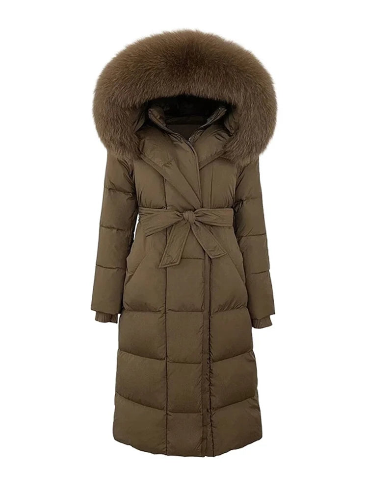 Lang vatteret vinterfrakke til kvinder | Bindebælte | Hætte med imitert pelskant
