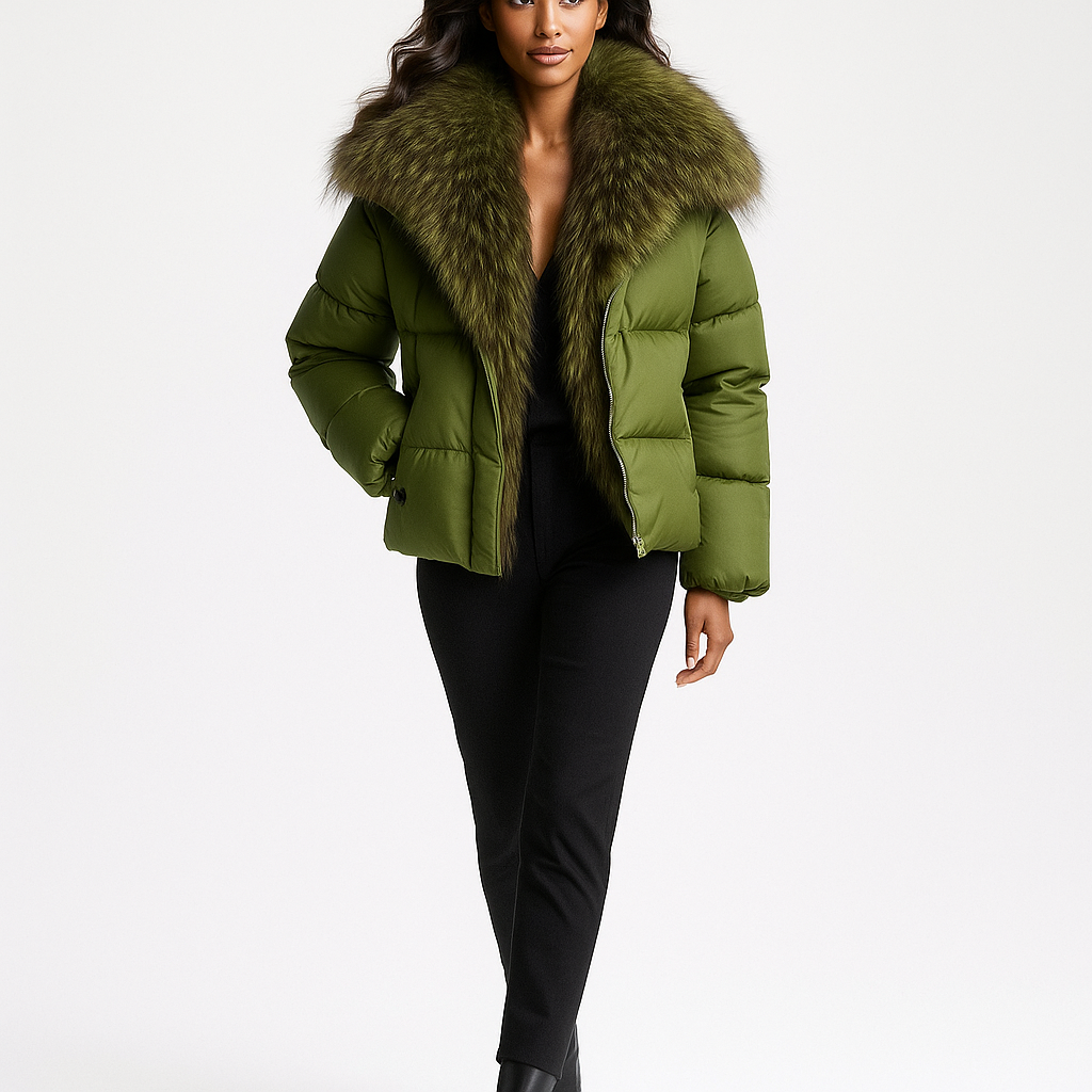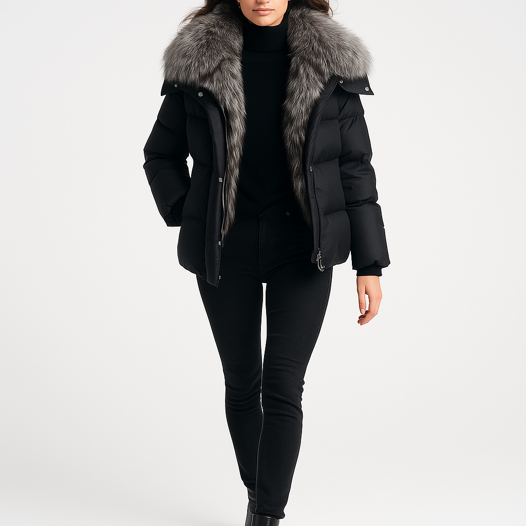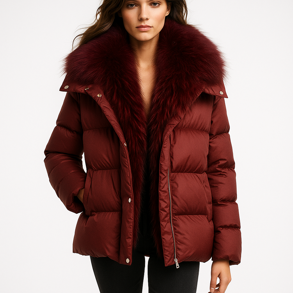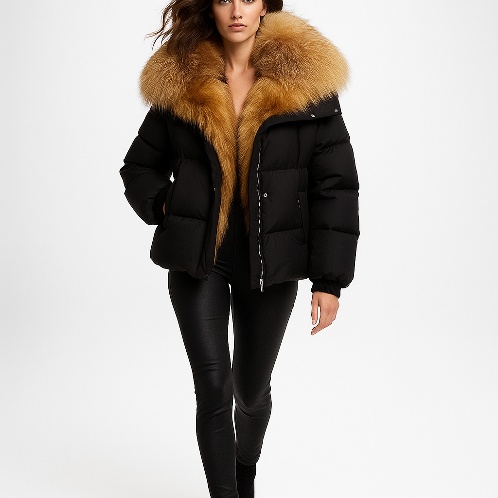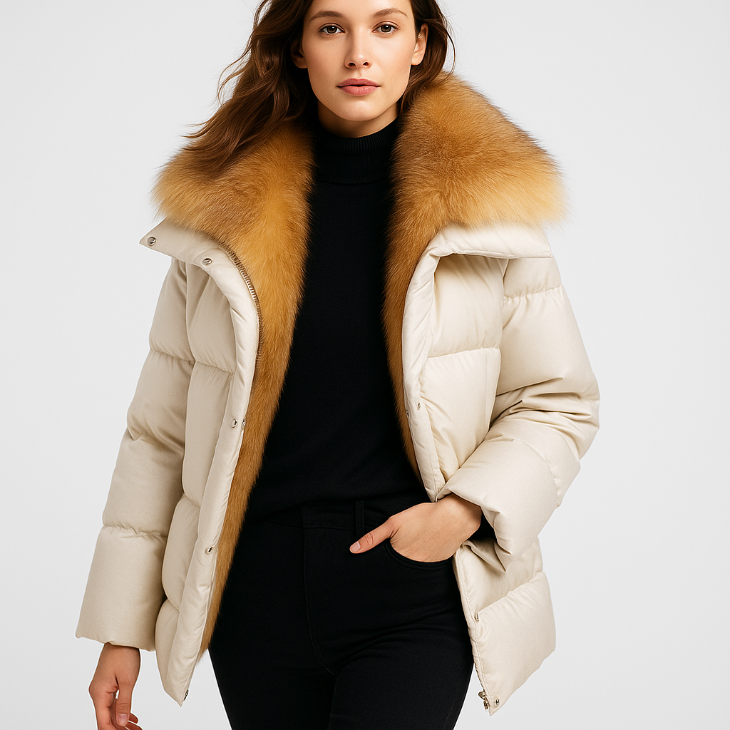 Gør dig klar til vinteren med denne eksklusive dunjakke, der kombinerer maksimal varme med sofistikeret elegance. Jakken er fyldt med 90% hvid gåsedun for optimal isolering og har en overdådig ægte rævepelskrave, der tilfører et luksuriøst udtryk. De aftagelige ærmer giver fleksibilitet og gør den ideel til skiftende vejr.