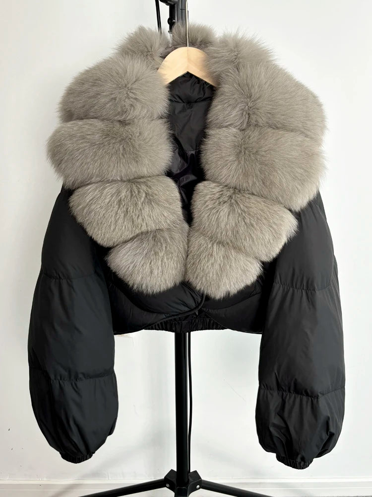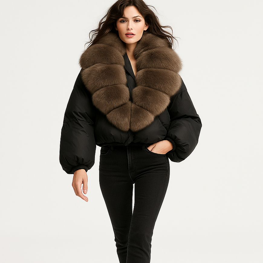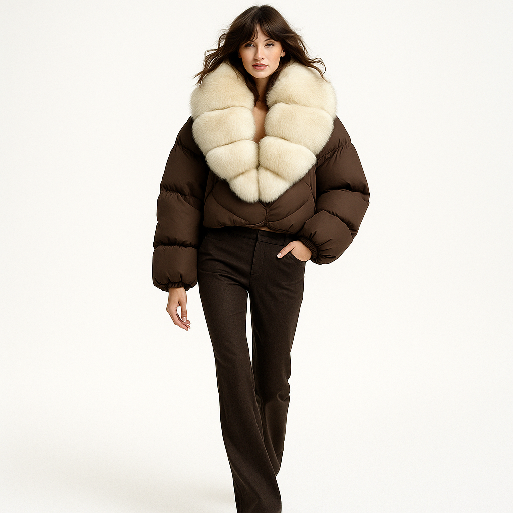 Denne eksklusive vinterjakke kombinerer luksus, varme og tidløst design. Med en stor, naturlig rævepelskrave og 90% fyld af hvidt andedun, leverer den både overlegen varmeisolering og et sofistikeret look. Den korte puffer-silhuet skaber en moderne kontrast til den overdådige pelskrave – perfekt til kolde vinterdage, hvor du ikke vil gå på kompromis med stil.