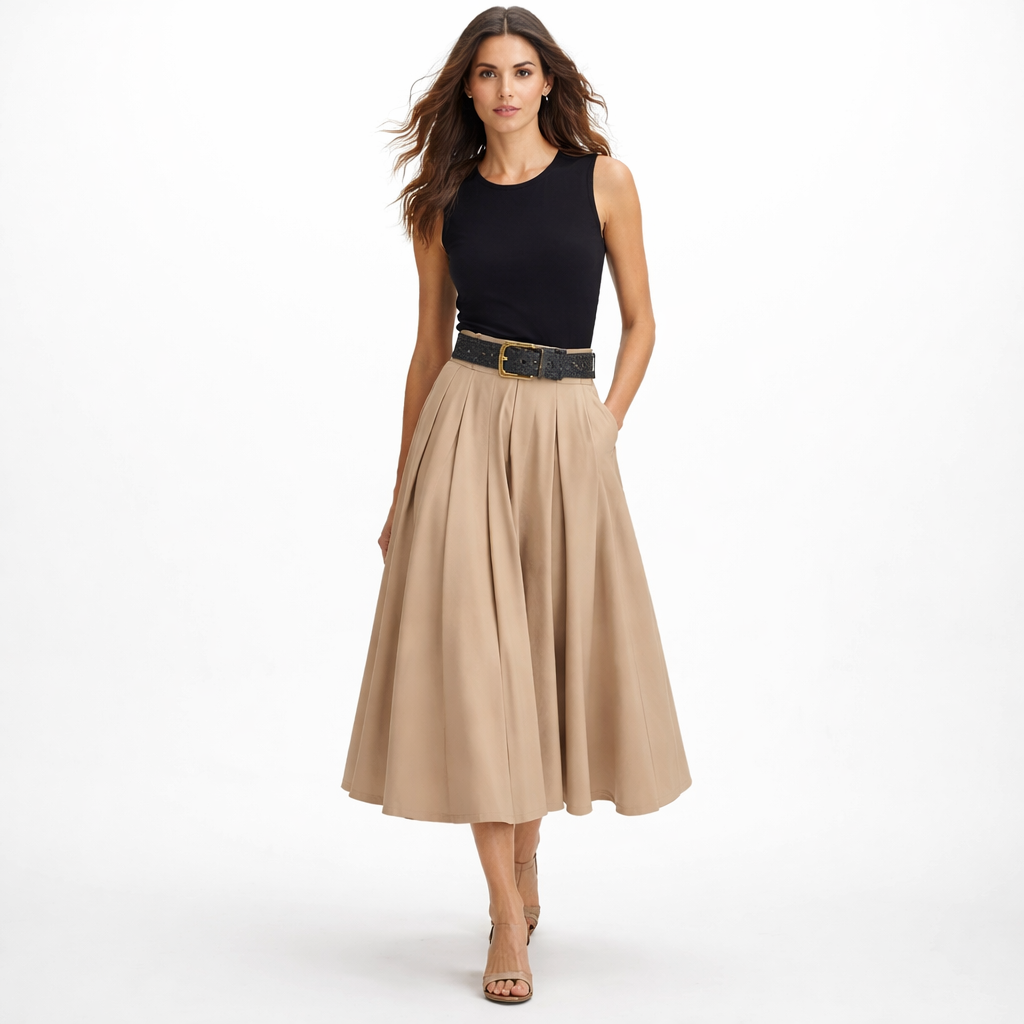 – Design: Ærmeløs overdel kombineret med plisseret midi-nederdel
