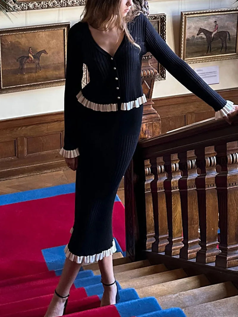 Et feminint og sofistikeret sæt designet til at skabe et poleret og harmonisk udtryk. Den figursyede cardigan med dekorative knapper kombineres med den lange ribstrikkede nederdel, der giver en smuk, strømlinet silhuet. Et klassisk og moderne outfit, perfekt til både arbejde, middage og stilfulde hverdagsanledninger.