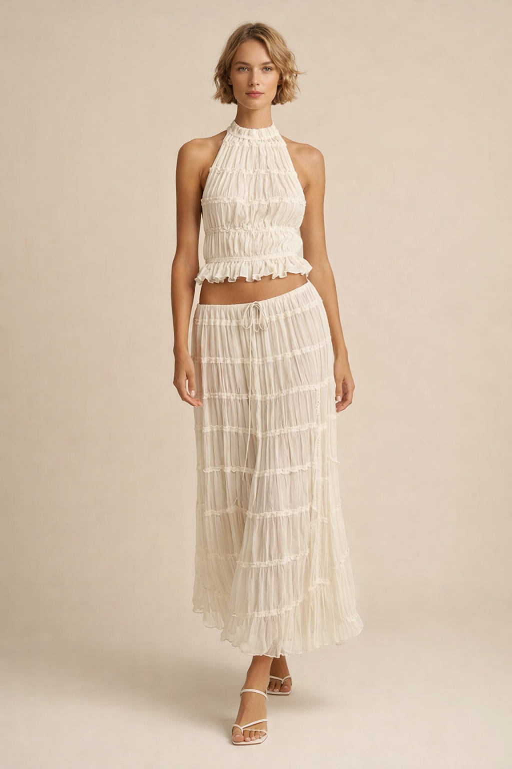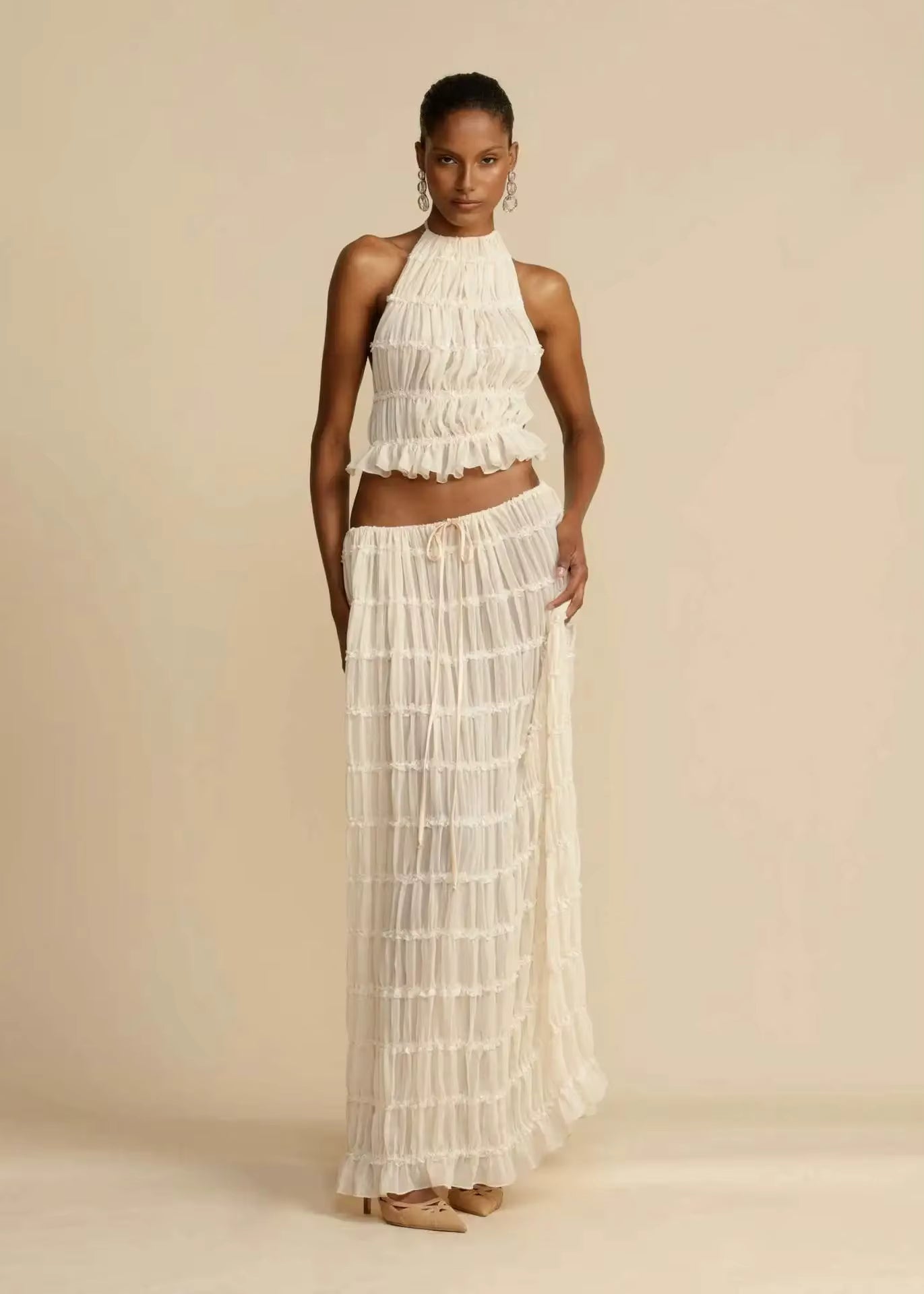 Oplev sofistikeret stil og komfort med dette trendy halterneck-skjørtsæt – et elegant to-delt sæt designet til at skabe et stilfuldt og moderne look. Perfekt til sommerfester, aftener ude eller afslappede sammenkomster.