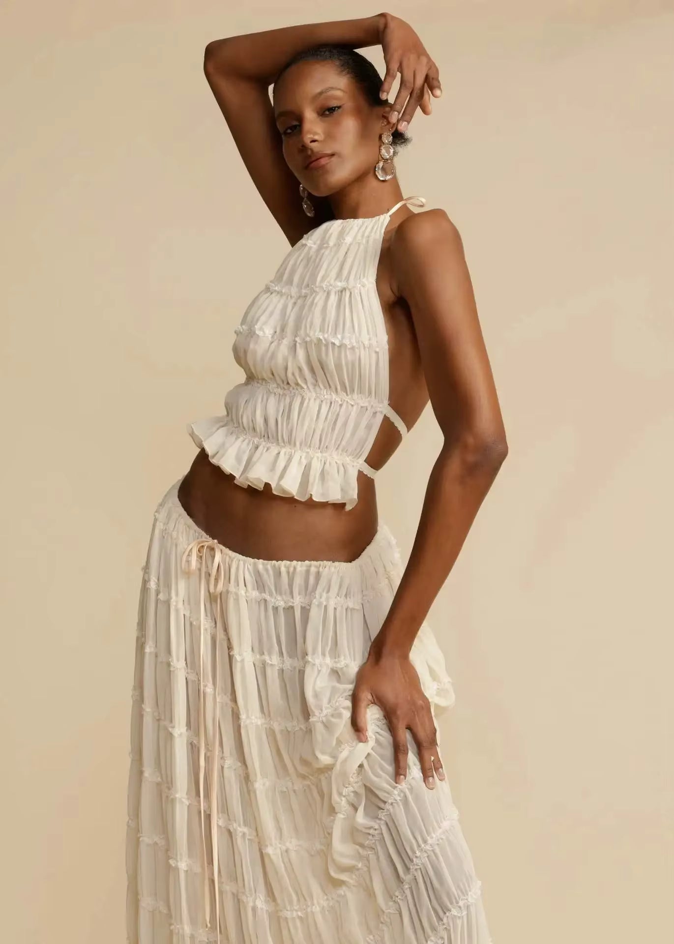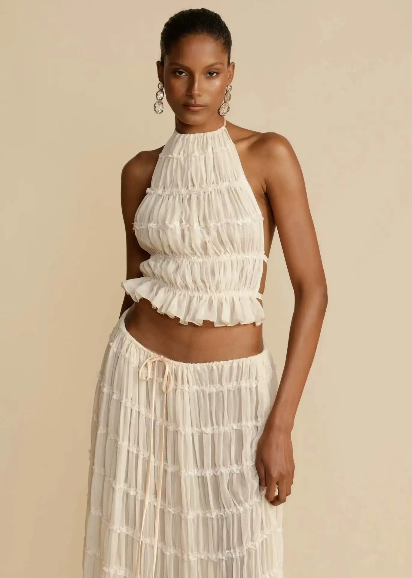 Sommersæt til kvinder | Rygløs slyngetop med snørelukning og plisseret maxinederdel