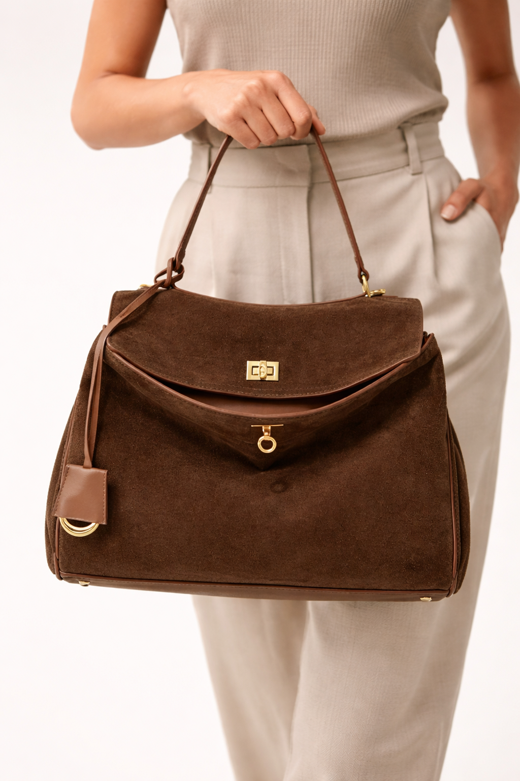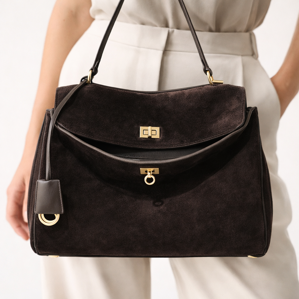 Stor skuldertaske til kvinder i ruskind med struktureret design og rummelig form