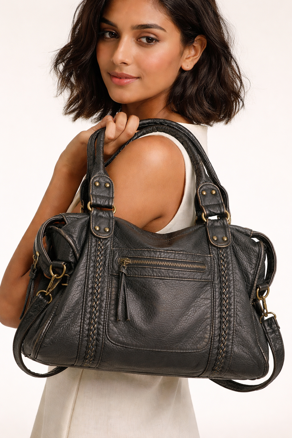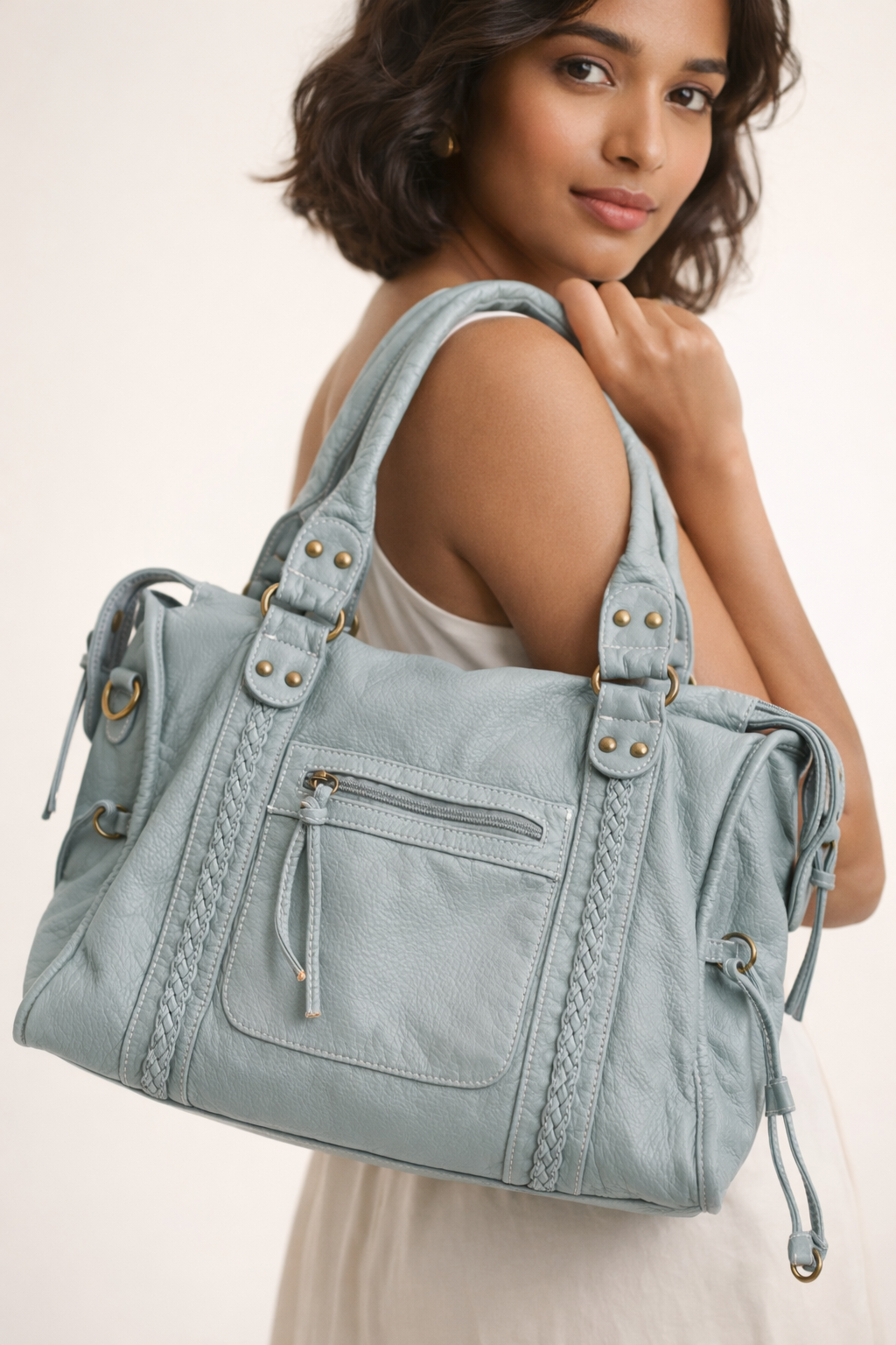 Stor skuldertaske til kvinder med flettede detaljer og rummelig tote-form