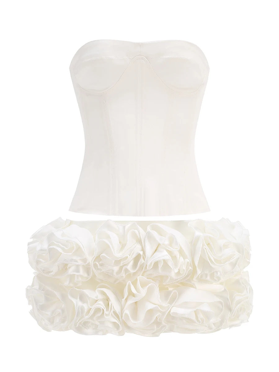 Et dramatisk og glamourøst sæt designet til særlige lejligheder, hvor et elegant og selvsikkert look er i fokus. Den stropløse, figurskabende top skaber en skulpturel silhuet, mens den voluminøse mininederdel med blomsterinspirerede detaljer giver et unikt, luksuriøst udtryk. Et perfekt outfit til cocktailfester, events og aftenbegivenheder, hvor du ønsker at skille dig ud på den mest sofistikerede måde.