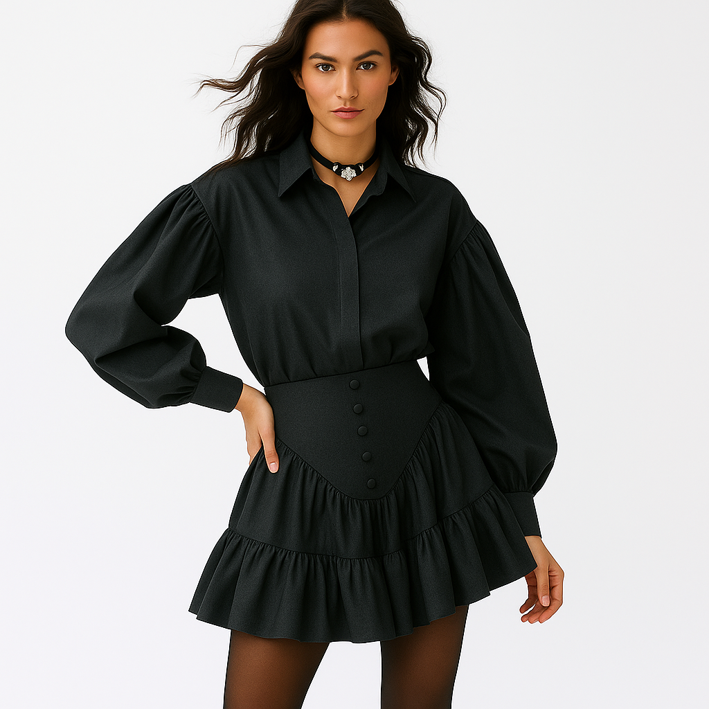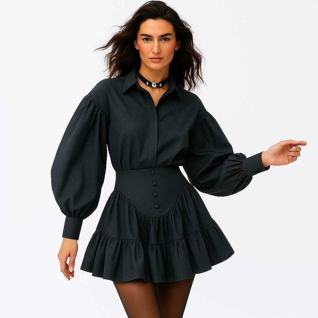 To-delt blusesæt til kvinder | Løstsiddende skjorte med pufærmer | Rynket mini-nederdel