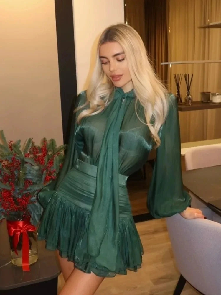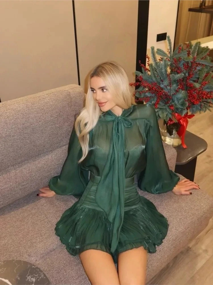 Oplev et feminint og tidløst udtryk med dette elegante to-delte sæt. Den lette bluse med sløjfe i halsen og den plisserede mini-nederdel skaber et raffineret look, perfekt til festlige begivenheder eller stilfulde aftener ude.