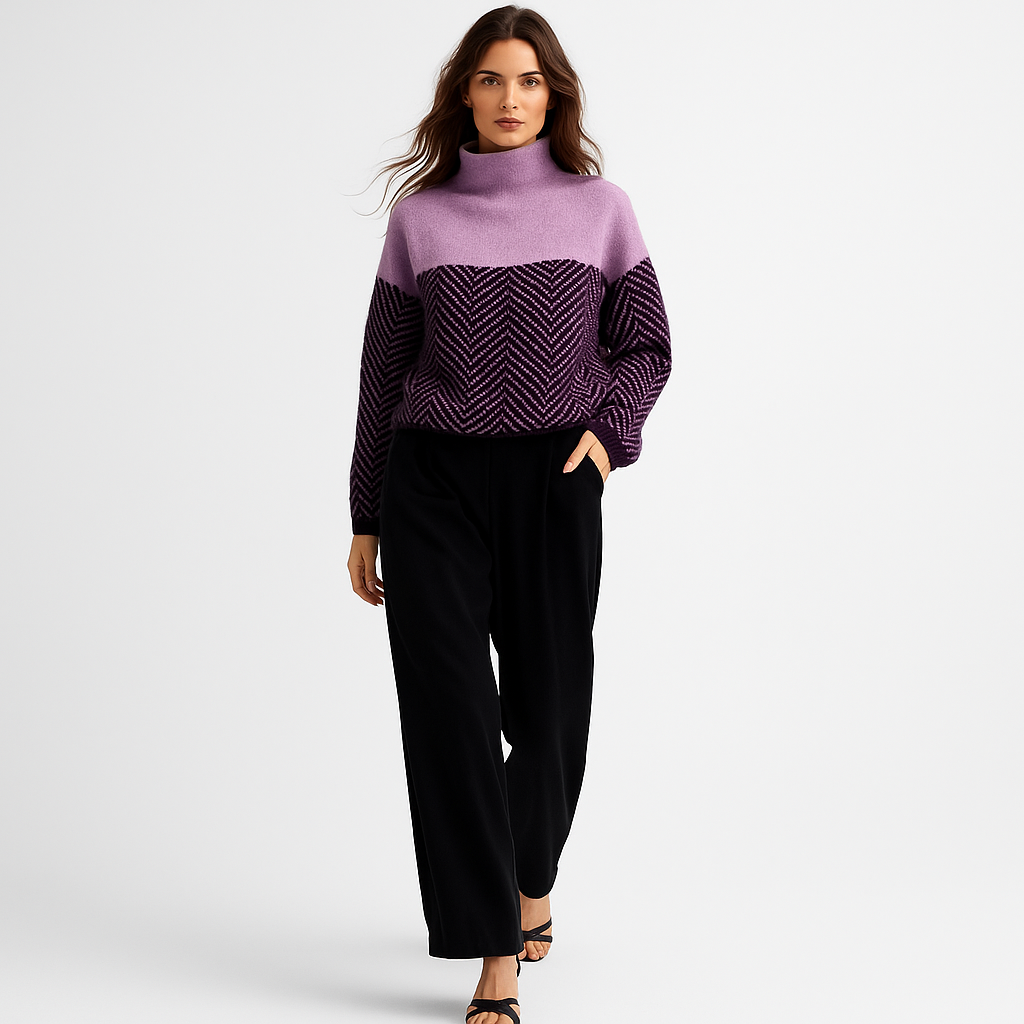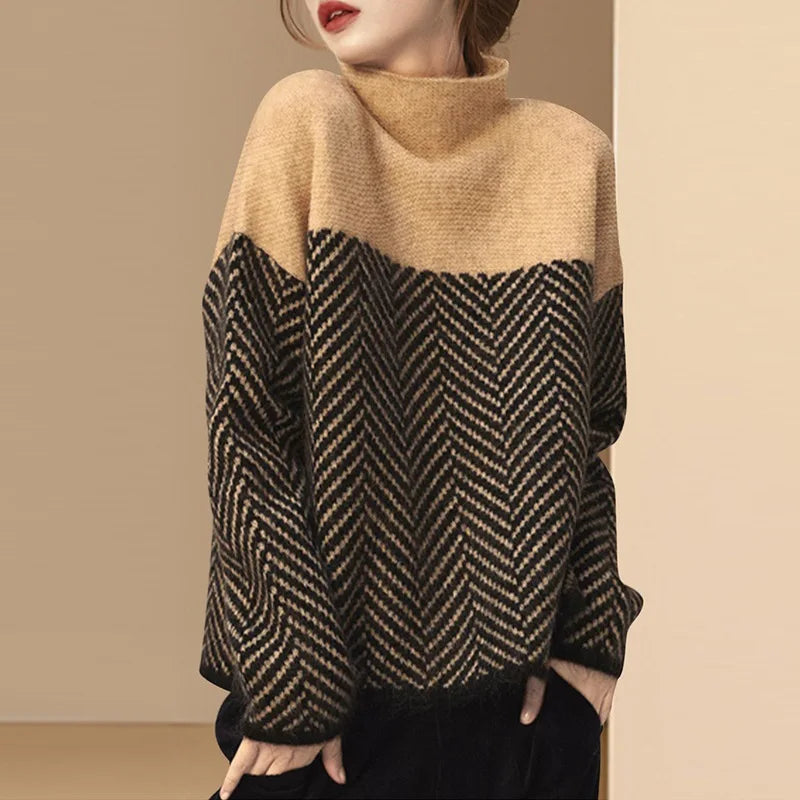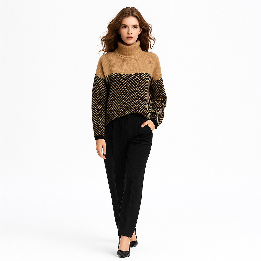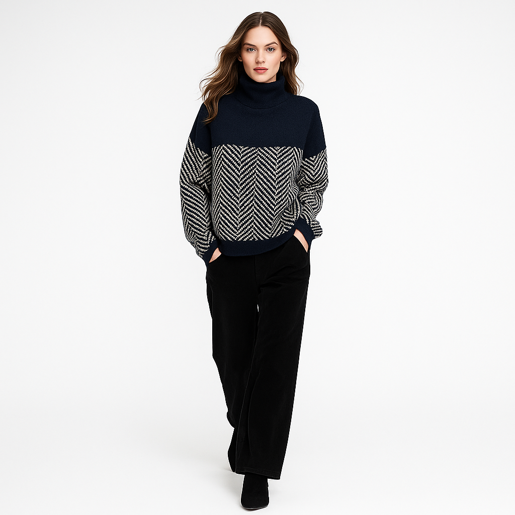 Dame rullekravesweater i diamantstrik | Løs pasform | Varm efterårs-/vintertrøje