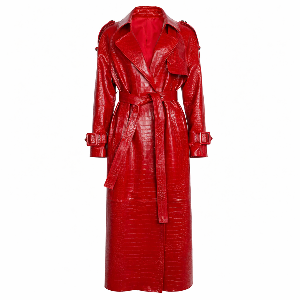Vindafvisende lang trenchcoat i ægte læder til kvinder med bælte